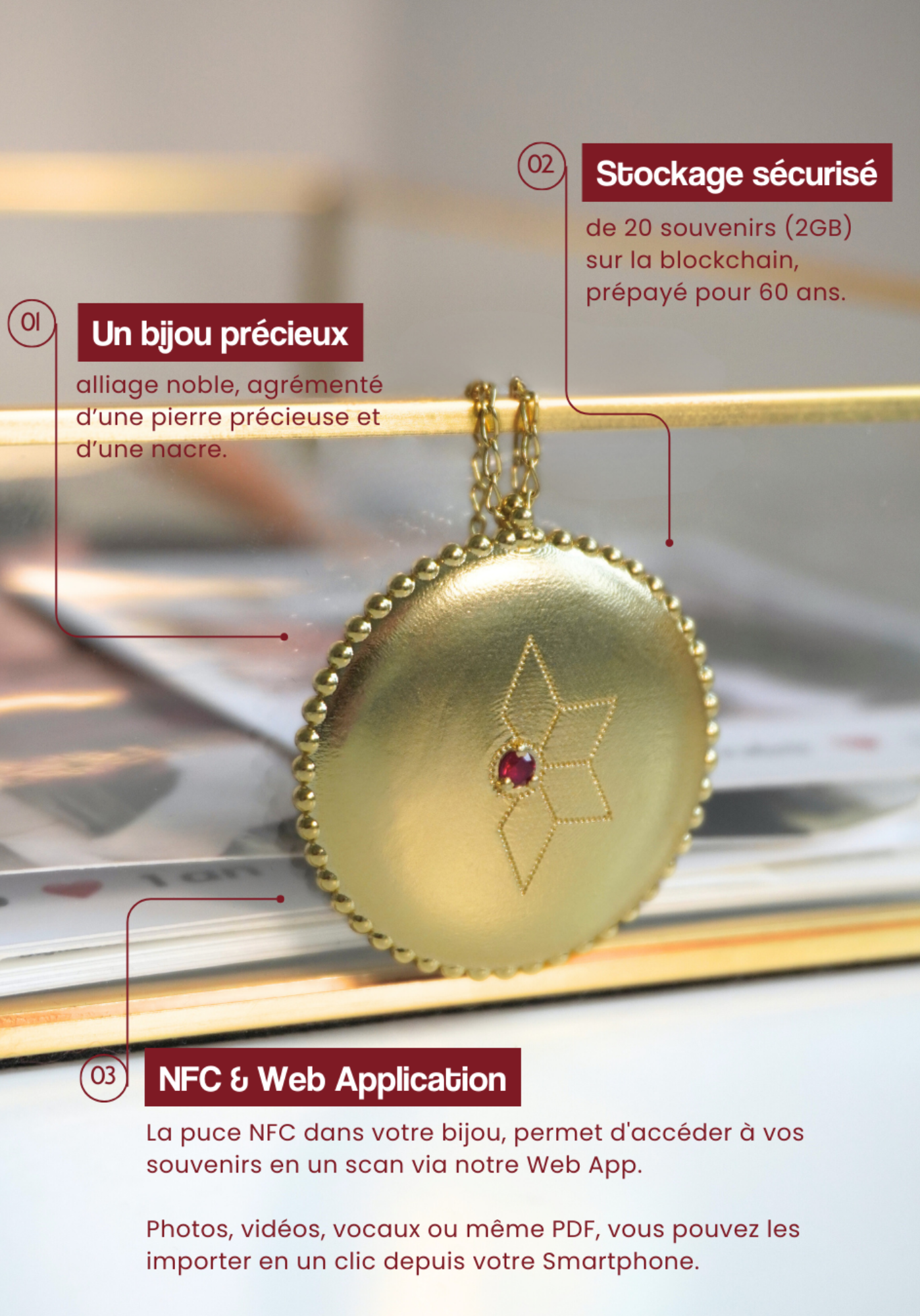 Nos médaillons sont dotés d'une puce NFC, liée à un espace de stockage personnel sécurisé sur la blockchain.